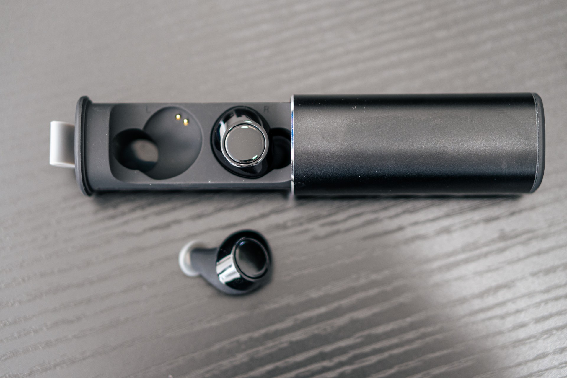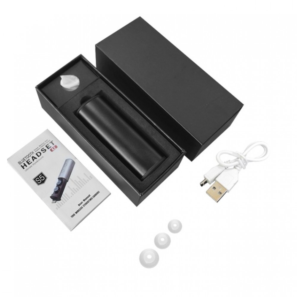- Wbudowany pojemnik na baterie, za pomocą którego można ładować zestawy słuchawkowe 15 razy